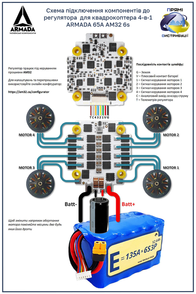 - Під'єднайте регулятор до приймача чи контроллера польоту для живлення борта та іншої периферії. Дотримуйтесь інструкцій та використовуйте за призначенням.