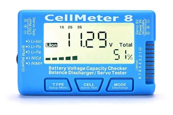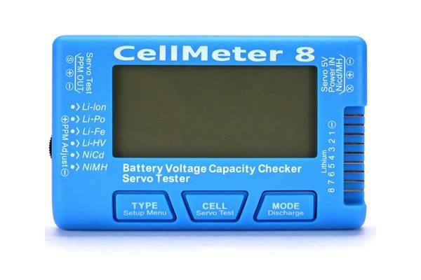 - Цифровой тестер CellMeter 8, который должен быть у каждого моделиста. Подходит для индикации состояния батарей в полевых условиях. По сравнению с версией CellMeter 7, здесь появилась функция сервотестера, режимы разряда и балансировки.