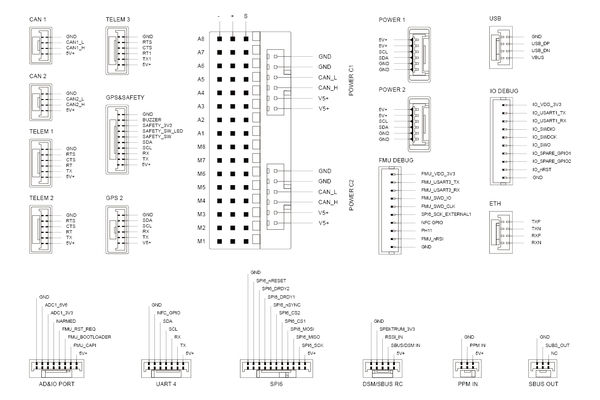 - 1 шина SPI6 2 входи живлення з шиною I2C (живлення 1 та живлення 2) 2 входи живлення з шиною CAN (живлення C1 та живлення C2) 16 ШІМ-виходів сервоприводу (A1-8 від STM32H753 на платі FMU та M1-8 від STM32F103 на платі вводу-виводу)